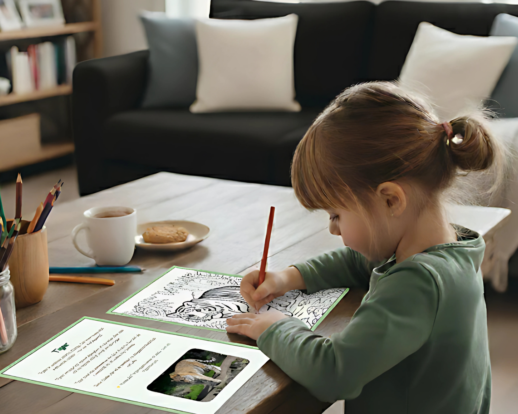 Vi använder materialet både på iPad och i utskriven version. Det är så snyggt upplagt: först en hel bild att färglägga, sedan en hel faktasida om djuret – perfekt för barn som är nyfikna. Min dotter älskar särskilt att läsa upp fakta för mig efter att hon färglagt. Det känns som att vi har hittat något som både är kul och utvecklande.