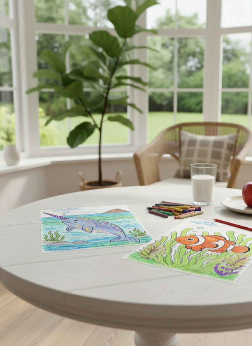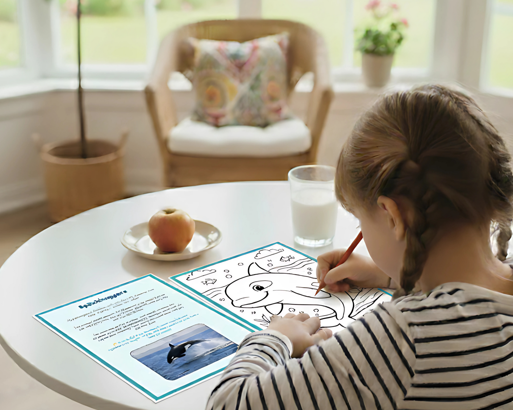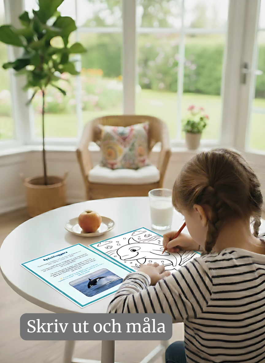 Barnen får färglägga havets djur, från delfiner till sjölejon, samtidigt som de lär sig spännande fakta. Anpassad för barn 4–10 år och levereras som PDF, redo att skrivas ut eller användas direkt på surfplatta.