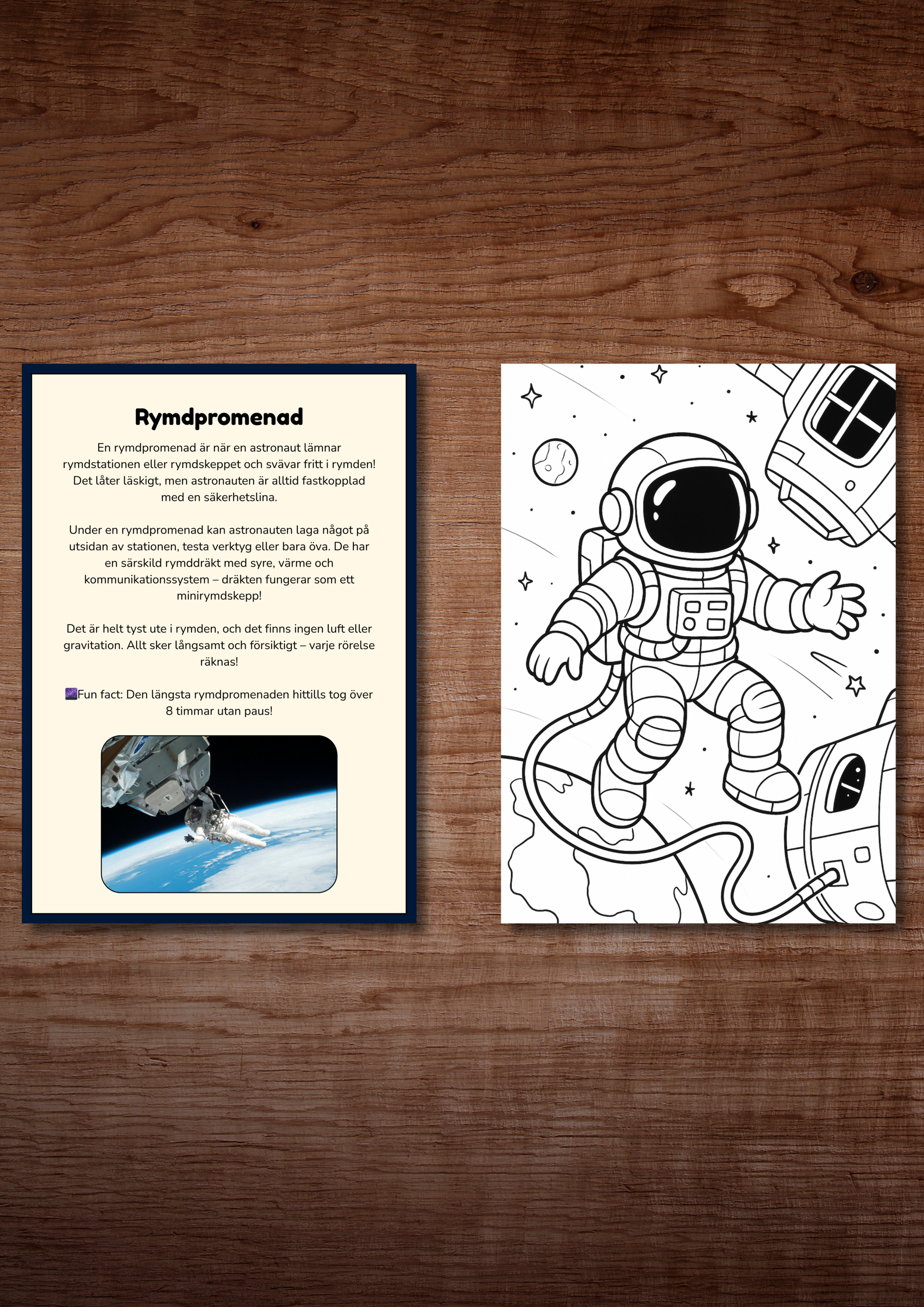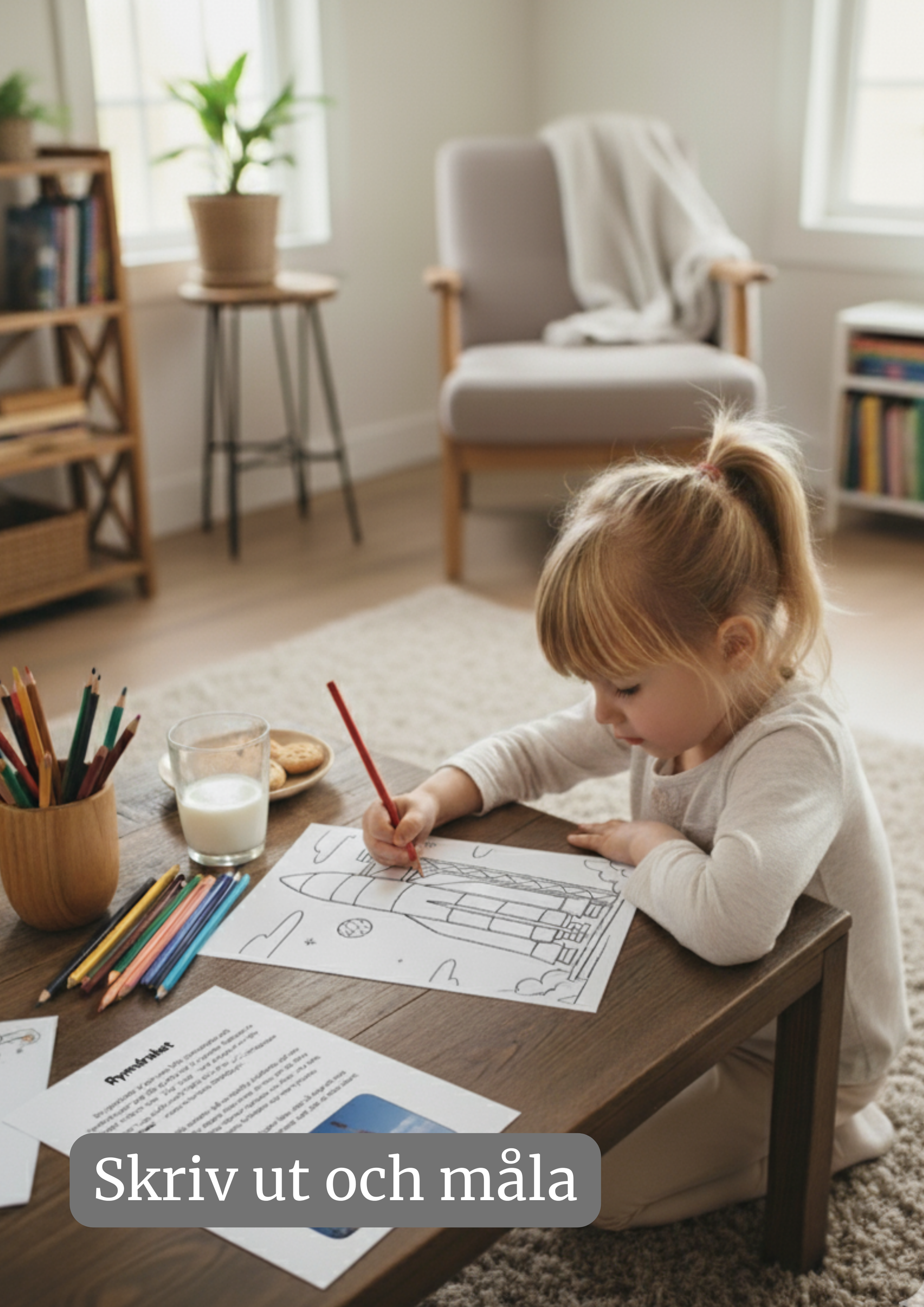 Mitt Rymdäventyr tar barnen med på en färgstark resa bland planeter, raketer och stjärnor. Med 12 målarbilder och lika många faktasidor får barn 4–10 år både fantasi och kunskap att växa. Levereras som PDF, redo att skrivas ut eller användas på surfplatta.