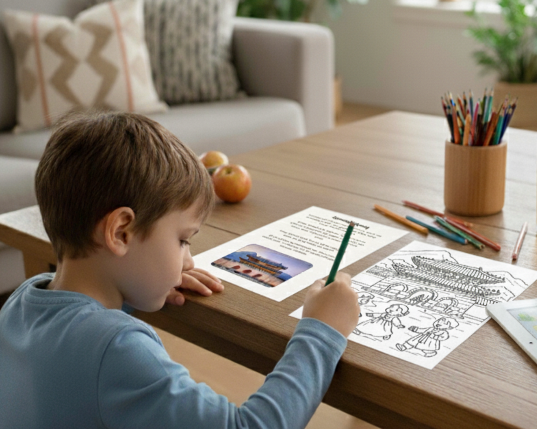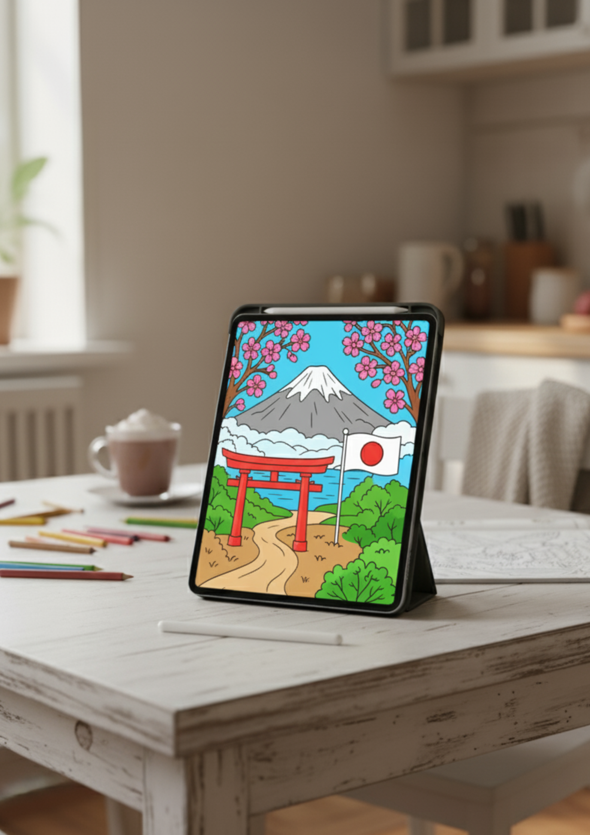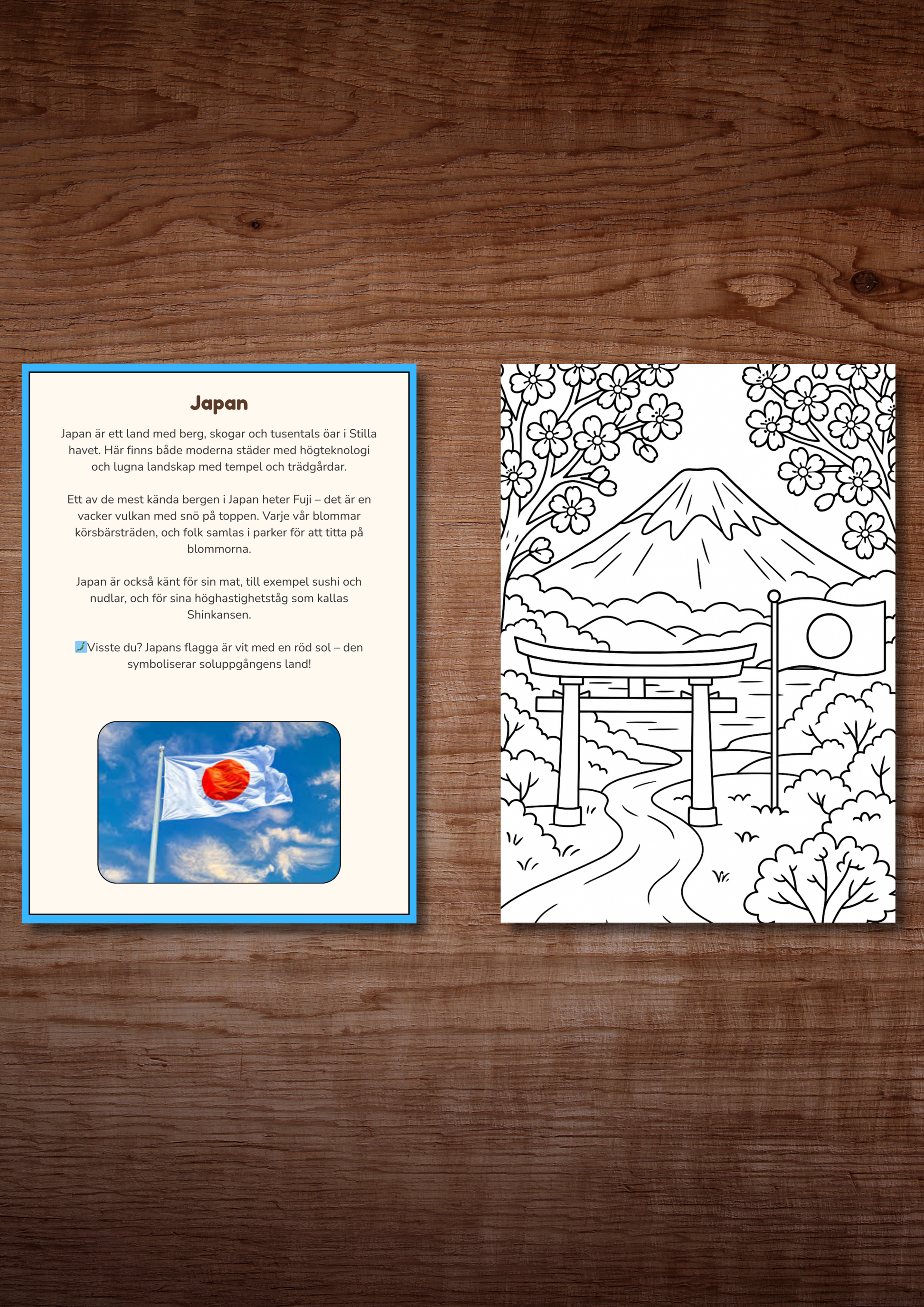 Res genom Asien tar barnen med till tio länder, från Japans körsbärsblom till Indiens festivaler och Thailands gyllene tempel. Med 30 målarbilder och lika många faktasidor får barn 4–10 år upptäcka flaggor, platser och kulturer på ett lekfullt sätt. Levereras som PDF, redo för surfplatta eller utskrift.