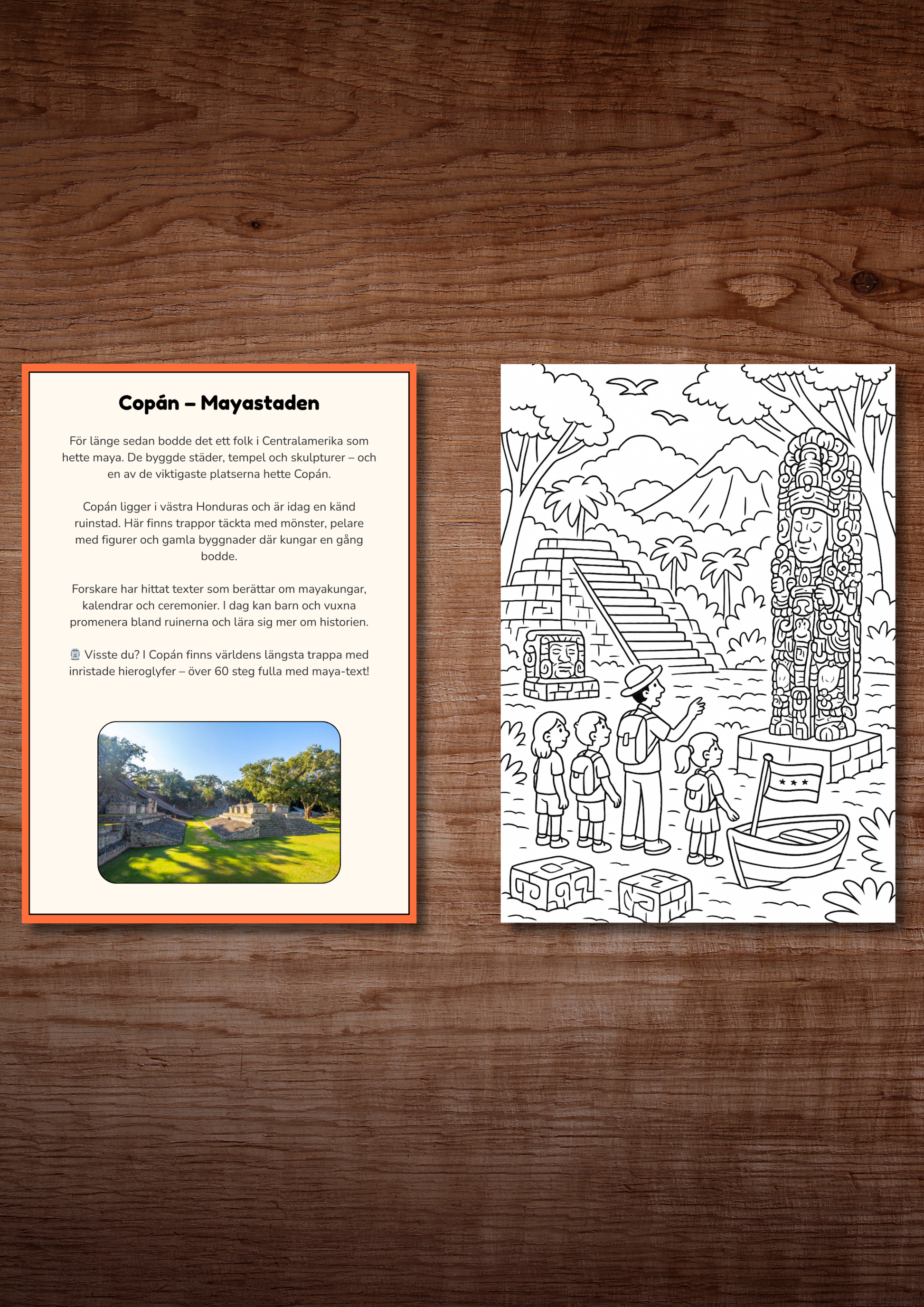 Res genom Centralamerika & Karibien tar barnen med till tio länder, från Costa Ricas regnskogar till Jamaicas musik och Kubas färgstarka gator. Med 30 målarbilder och lika många faktasidor får barn 4–10 år upptäcka flaggor, platser och kulturer på ett lekfullt sätt. Levereras som PDF, redo för surfplatta eller utskrift.
