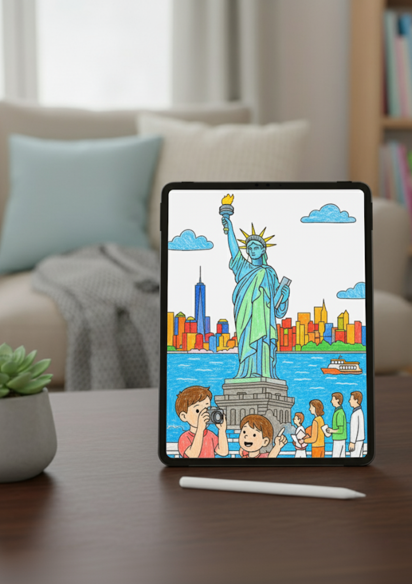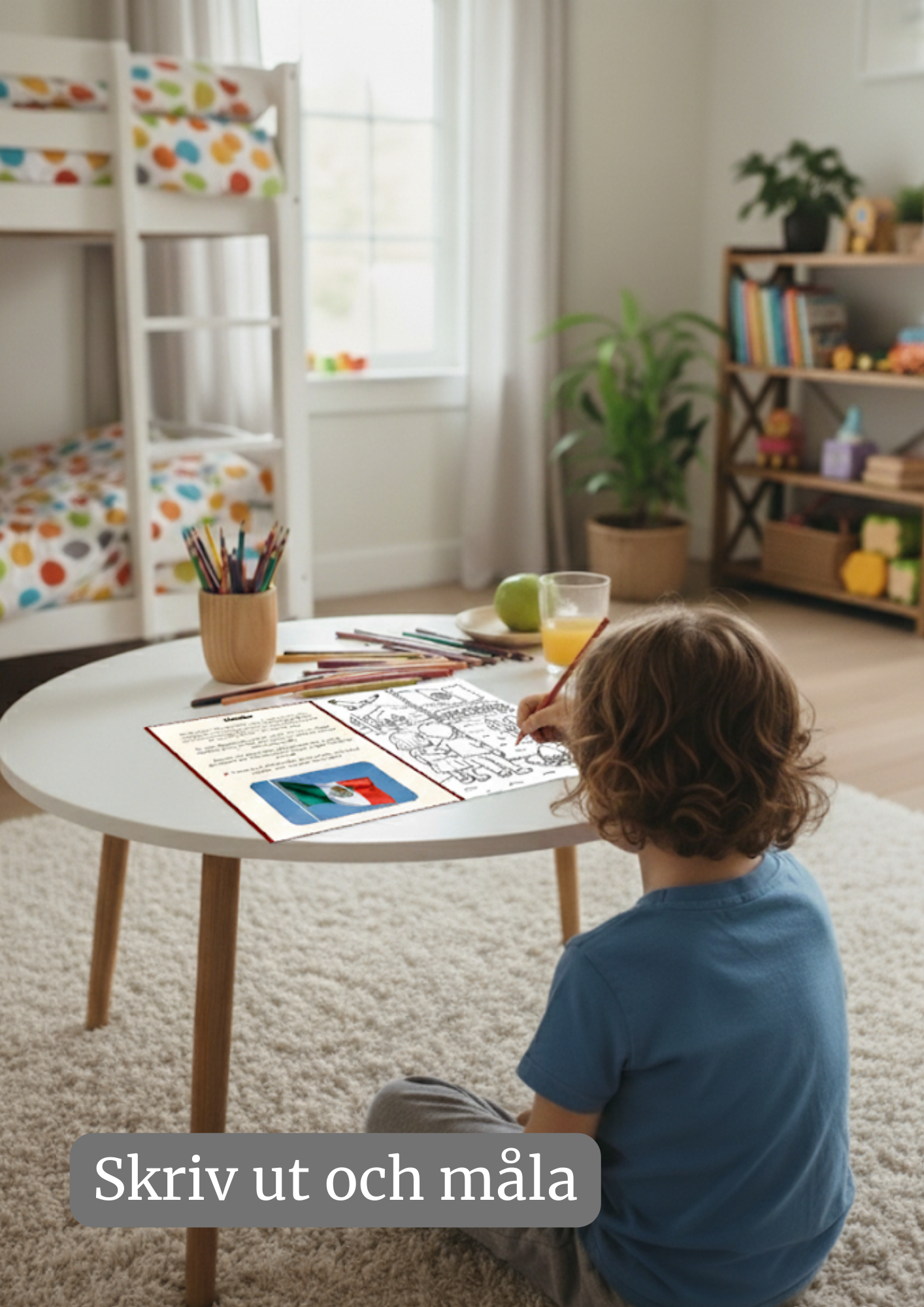 Res genom Nordamerika tar barnen med på en färgstark resa från Mexikos marknader och mayaruiner till Alaskas glaciärer och Hawaiis vulkaner. Med 30 målarbilder och lika många faktasidor får barn 4–10 år upptäcka flaggor, platser och kulturer på ett lekfullt sätt. Levereras som PDF, redo för surfplatta eller utskrift.